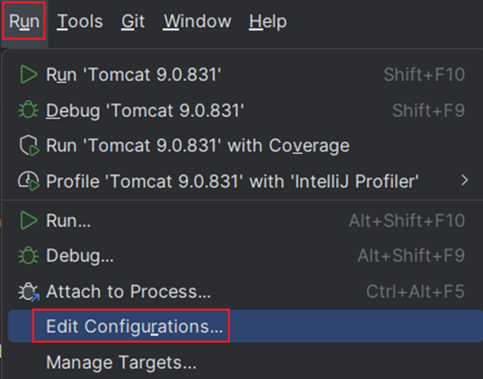 - 인텔리제이 기준 Run > Edit Configurations로